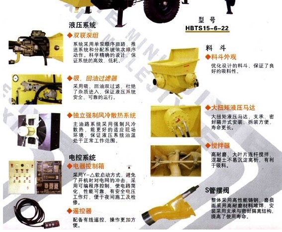電機 主油泵(現在一般用韓國川崎的進口主油泵) 電磁閥(國內用華德的多) 料缸 主油缸(國內品牌好的是協力油缸) 潤滑泵 (6路潤滑泵)風冷(冷卻液壓油的,也有廠家用水冷,水冷工地需要接水,就是這個麻煩一些)電控柜 (PLC歐姆龍的比較好點)
